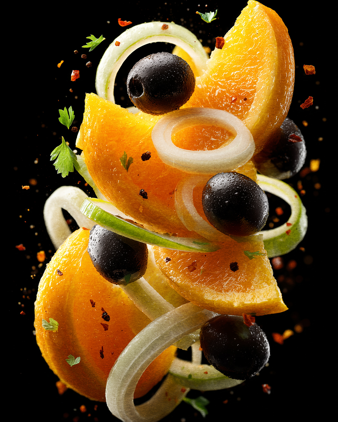 Именно апельсин придаёт салату тот самый узнаваемый оттенок — баланс сладости и лёгкой кислинки, делающий блюдо необычным и запоминающимся.